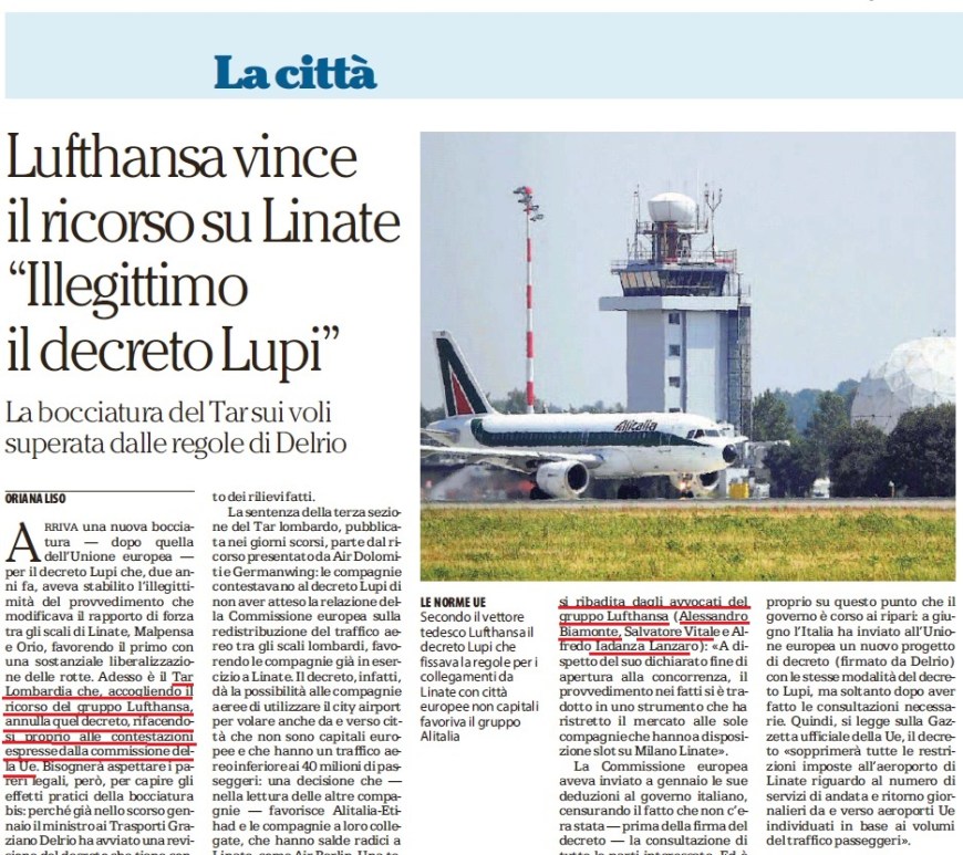 Milano. – Arriva una nuova bocciatura — dopo quella dell’Unione europea — per il decreto Lupi che, due anni fa, aveva stabilito l’illegittimità del provvedimento che modificava il rapporto di forza tra gli scali di Linate, Malpensa e Orio, favorendo il primo con una sostanziale liberalizzazione delle rotte. Adesso è il Tar Lombardia che, accogliendo il ricorso del gruppo Lufthansa, annulla quel decreto, rifacendosi proprio alle … Continua a leggere La Repubblica: Lufthansa vince il ricorso su Linate.