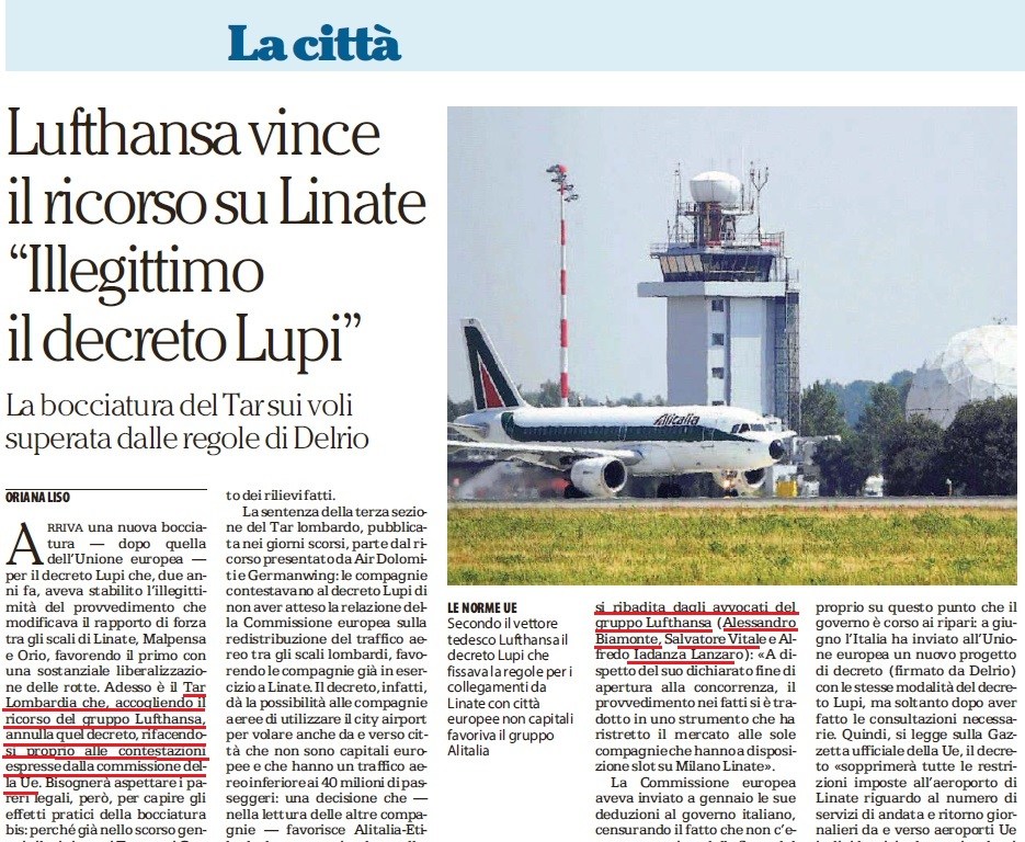 Milano. – Arriva una nuova bocciatura — dopo quella dell’Unione europea — per il decreto Lupi che, due anni fa, aveva stabilito l’illegittimità del provvedimento che modificava il rapporto di forza tra gli scali di Linate, Malpensa e Orio, favorendo il primo con una sostanziale liberalizzazione delle rotte. Adesso è il Tar Lombardia che, accogliendo il ricorso del gruppo Lufthansa, annulla quel decreto, rifacendosi proprio alle contestazioni espresse dalla commissione della Ue… Una tesi ribadita dagli avvocati del gruppo Lufthansa (Alessandro Biamonte, Salvatore Vitale e Alfredo Iadanza Lanzaro): «A dispetto del suo dichiarato fine di apertura alla concorrenza, il provvedimento nei fatti si è tradotto in uno strumento che ha ristretto il mercato alle sole compagnie che hanno a disposizione slot su Milano Linate»